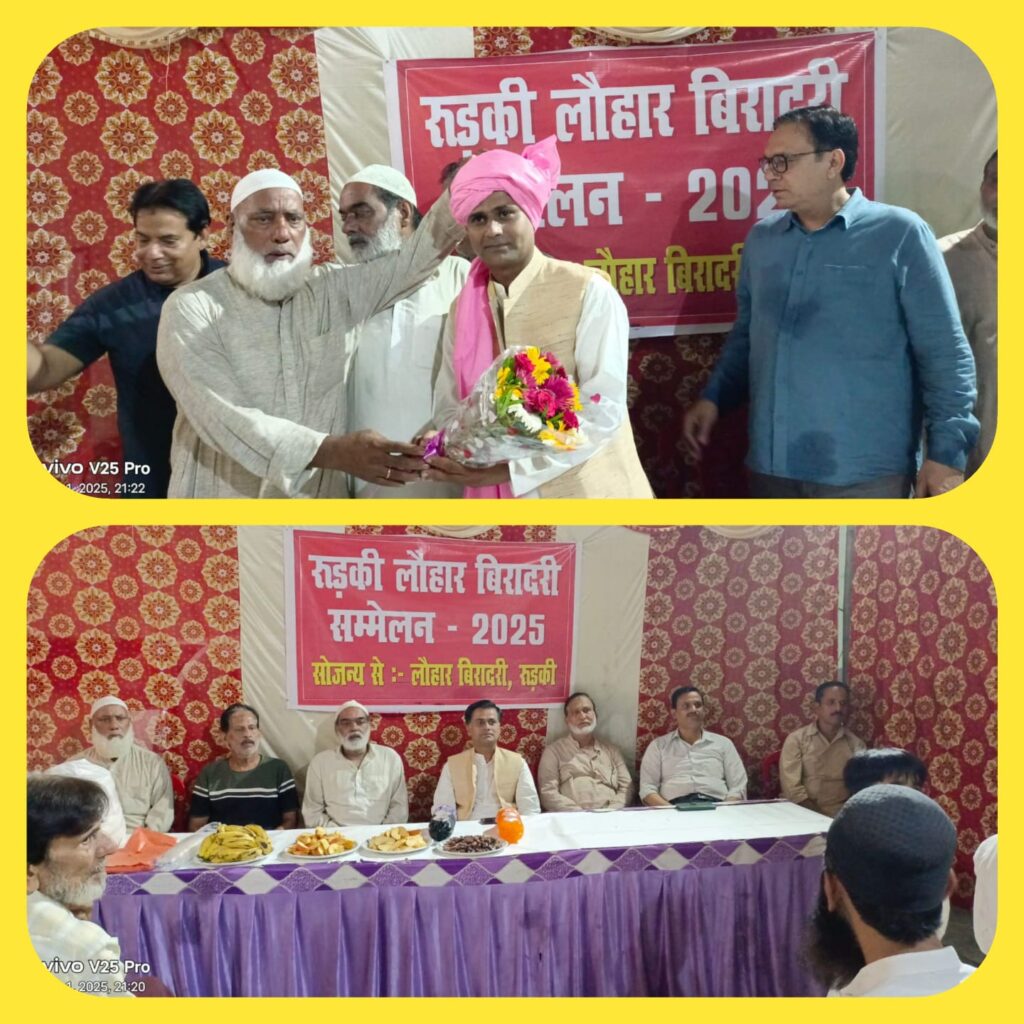 रुड़की। कल रात रुड़की के सत्ती मोहल्ले में लौहार बिरादरी का एक भव्य सम्मेलन आयोजित किया गया। लंबे समय से चली आ रही बैठकों, मशवरे और रायशुमारी के बाद आखिरकार बिरादरी ने एकजुट होकर इंजीनियर मोहम्मद मुबशशीर एडवोकेट को अपना निर्विरोध जिला अध्यक्ष/सदर/चौधरी चुन लिया। इस अवसर पर बिरादरी के वरिष्ठ मौजिस लोगों ने उन्हें पगड़ी बांधकर और माला पहनाकर सम्मानित किया।लौहार बिरादरी के बड़े-बुजुर्गों और जिम्मेदार लोगों ने पिछले कई हफ्तों से लगातार बैठकों और सलाह-मशवरे का दौर चलाया था। बिरादरी के हित को ध्यान में रखते हुए विभिन्न चेहरों पर चर्चा हुई और अंततः सभी ने सर्वसम्मति से मोहम्मद मुबशशीर को अपना समर्थन दिया।मोहम्मद मुबशशीर एडवोकेट उत्तराखंड प्रदेश कांग्रेस कमेटी ओबीसी विभाग की लीगल सेल में प्रभारी भी हैं। वे लंबे समय से जनहित और सामाजिक मुद्दों पर सक्रिय भूमिका निभाते आए हैं। उनके निस्वार्थ सेवा भाव और समाजहित कार्यों को देखते हुए बिरादरी ने उन्हें अपने नेतृत्व के लिए चुना। इस अवसर पर उन्होंने कहा—