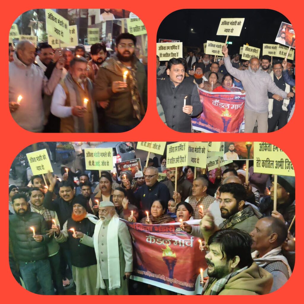 अंकिता भंडारी को न्याय दिलाने की मांग को लेकर कांग्रेस पार्टी ने एक बार फिर सड़कों पर उतरकर सरकार के खिलाफ जोरदार प्रदर्शन किया। महानगर जिला कांग्रेस कमेटी के तत्वावधान में आयोजित कैंडल मार्च महिला कांग्रेस की कार्यकारी अध्यक्ष रुड़की महानगर यास्मीन खान के नेतृत्व में निकाला गया। यह मार्च अंबेडकर चौक स्थित बाबा साहेब की प्रतिमा से शुरू होकर महाराणा प्रताप चौक पर समाप्त हुआ। कैंडल मार्च में सैकड़ों की संख्या में कांग्रेस के वरिष्ठ नेता, पदाधिकारी, कार्यकर्ता और महिलाएं शामिल हुईं।