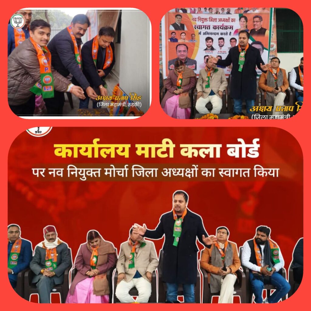 रुड़की। माटी कला बोर्ड के राज्य मंत्री आदरणीय श्री शोभाराम प्रजापति जी के कार्यालय में एक गरिमामय और उत्साहपूर्ण कार्यक्रम का आयोजन किया गया, जिसमें संगठनात्मक जिला रुड़की के नवनियुक्त विभिन्न मोर्चों के जिला अध्यक्षों का भव्य स्वागत एवं अभिनंदन किया गया। इस कार्यक्रम का सफल आयोजन युवा साथी श्री आयुष वर्मा जी द्वारा किया गया। बड़ी संख्या में कार्यकर्ताओं और पदाधिकारियों की उपस्थिति ने कार्यक्रम को विशेष बना दिया और पूरे परिसर में संगठनात्मक ऊर्जा और उत्साह का माहौल देखने को मिला।कार्यक्रम के दौरान युवा मोर्चा जिला अध्यक्ष श्री विभोर सेठी, अनुसूचित मोर्चा जिला अध्यक्ष श्री नीटू सिंह मड़ावर, महिला मोर्चा जिला अध्यक्ष श्रीमती नीलकमल शर्मा, किसान मोर्चा जिला अध्यक्ष श्री सुदेश चौधरी तथा अल्पसंख्यक मोर्चा जिला अध्यक्ष श्री राहुल मुल्तानी का पुष्पमालाओं, अंगवस्त्र और अभिनंदन-पत्रों के साथ सम्मान किया गया। सभी नवनियुक्त पदाधिकारियों को उनके नवीन दायित्वों के लिए हार्दिक बधाई और शुभकामनाएं दी गईं। कार्यक्रम में मौजूद वक्ताओं ने विश्वास व्यक्त किया कि नए पदाधिकारी संगठन को नई ऊर्जा, नई दिशा और मजबूती प्रदान करेंगे, साथ ही पार्टी की नीतियों को समाज के अंतिम व्यक्ति तक पहुंचाने में महत्वपूर्ण भूमिका निभाएंगे।