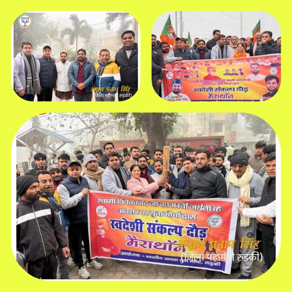 रुड़की। राष्ट्रीय युवा दिवस के अवसर पर भारतीय जनता पार्टी युवा मोर्चा द्वारा स्वदेशी संकल्प दौड़ का भव्य आयोजन किया गया। यह दौड़ युवाओं में स्वदेशी उत्पादों के प्रति जागरूकता बढ़ाने और आत्मनिर्भर भारत के लक्ष्य को साकार करने के उद्देश्य से आयोजित की गई। कार्यक्रम की शुरुआत स्वामी विवेकानंद के चित्र पर पुष्प अर्पित कर, उन्हें नमन और श्रद्धांजलि देने के साथ की गई। वक्ताओं ने स्वामी विवेकानंद के विचारों, आदर्शों और उनके जीवन संघर्ष को याद करते हुए कहा कि वे भारतीय युवाओं के लिए सदा प्रेरणास्रोत रहेंगे।